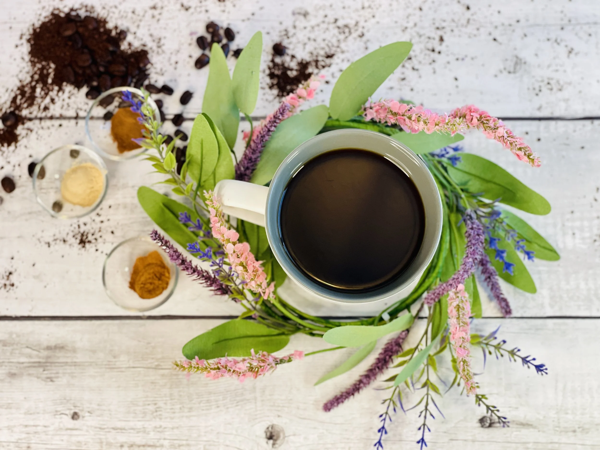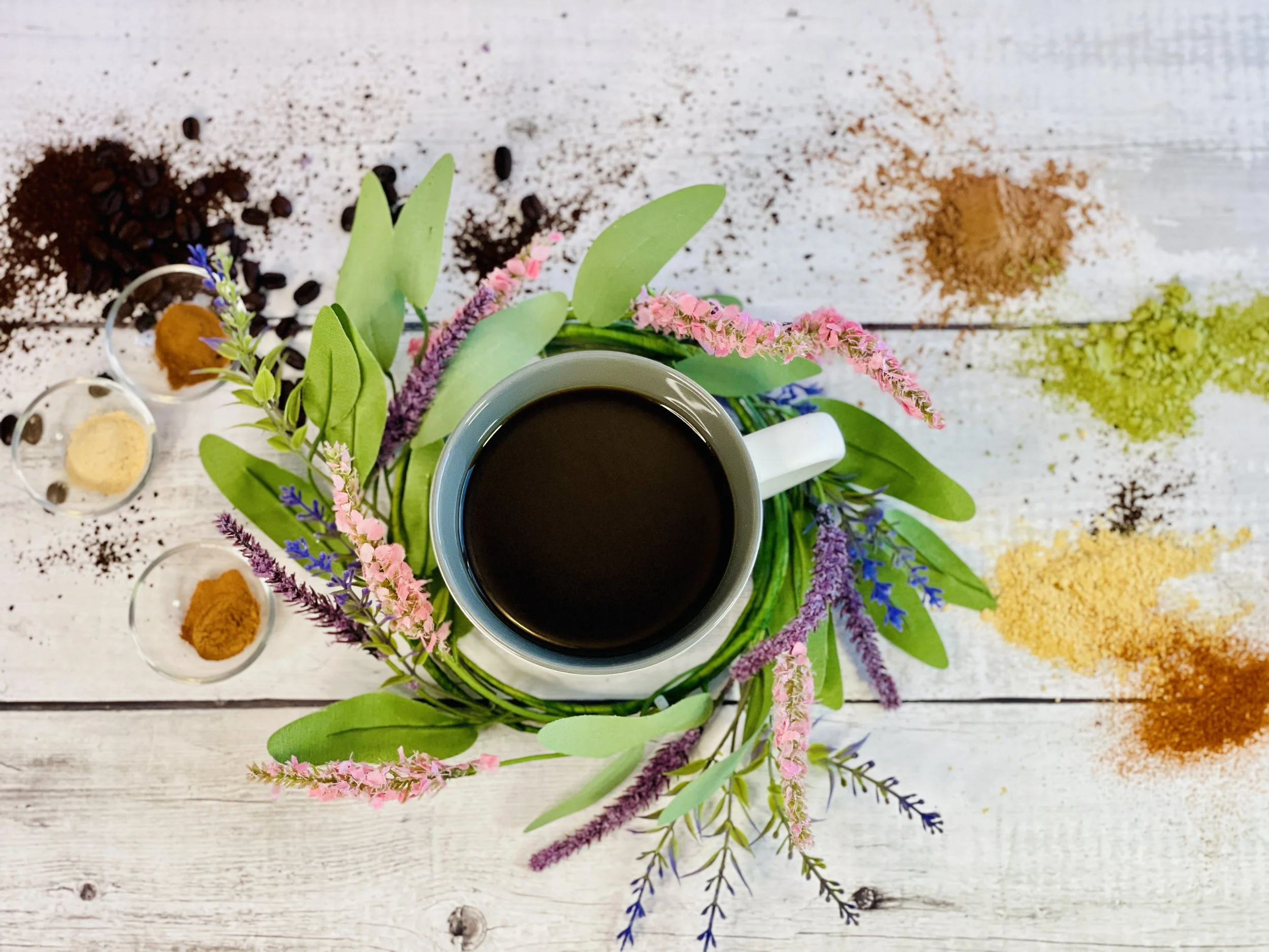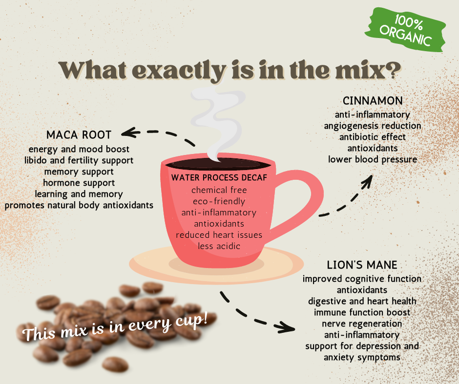 Decaf or half-caff, cinnamon, maca root powder, and lion’s mane.