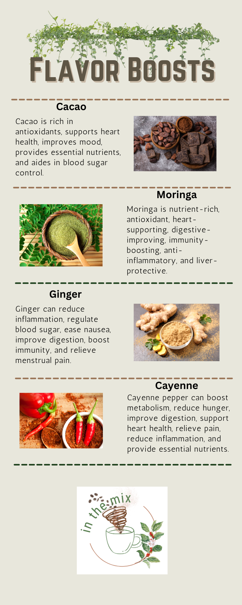 Base blend PLUS cacao, moringa, ginger, or cayenne. Double base is also available.